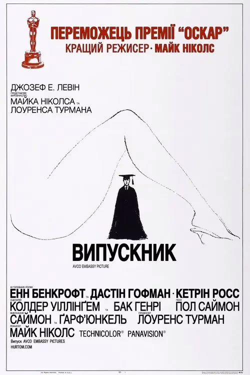 "Випускник" — класична стрічка 1967 року, яка досі актуальна.. Бенджамін, зневірений випускник, загруз у хаосі дорослого життя та забороненого кохання. Сатира на американське суспільство, саундтрек Саймона і Гарфанкела — шедевр. Фільм змушує сміятися й замислитися над вибором. .